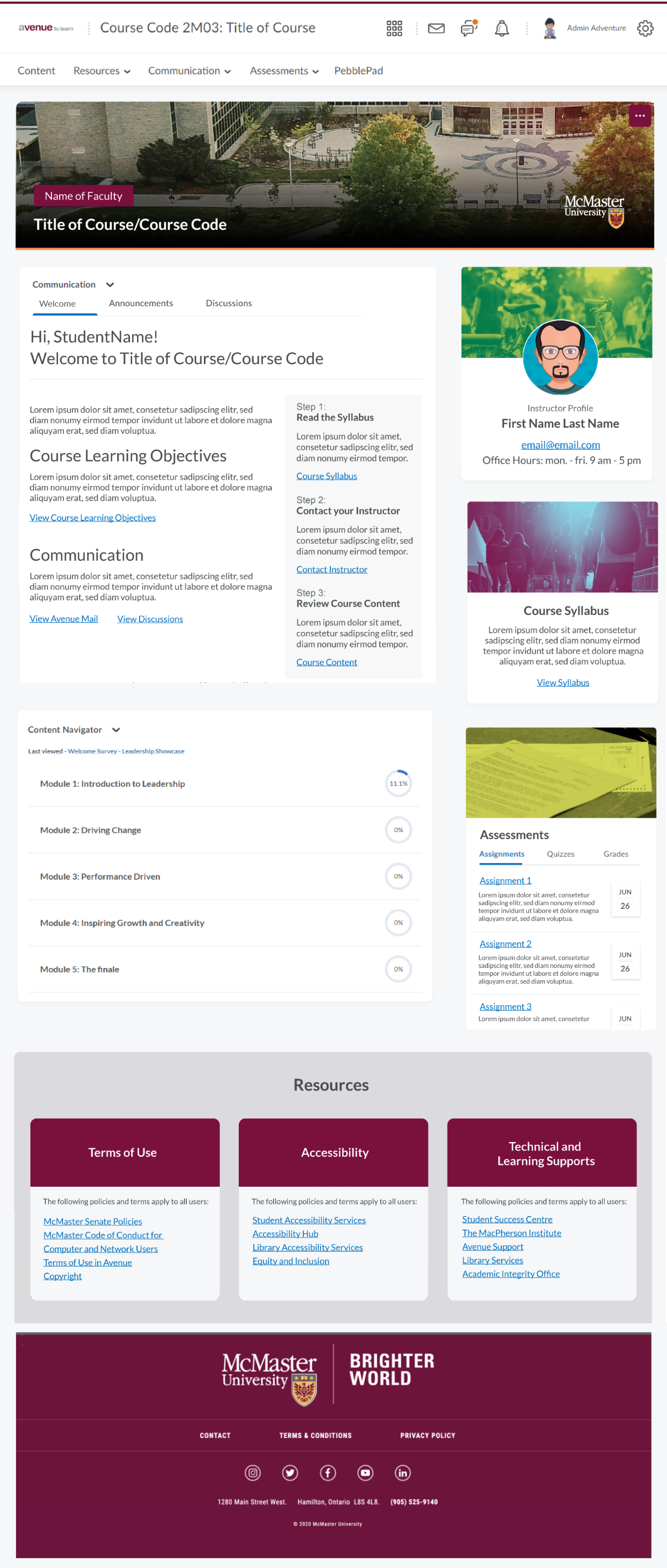 The new Avenue to Learn homepage includes several new widgets designed to simplify and speed access to content/information, improve usability, reduce confusion and provide an option for a consistent structure across courses and faculties. We recognize this template may not fit all types of courses. Instructors may choose to use the new homepage as designed, incorporate individual widgets from this homepage or choose a different approach entirely.